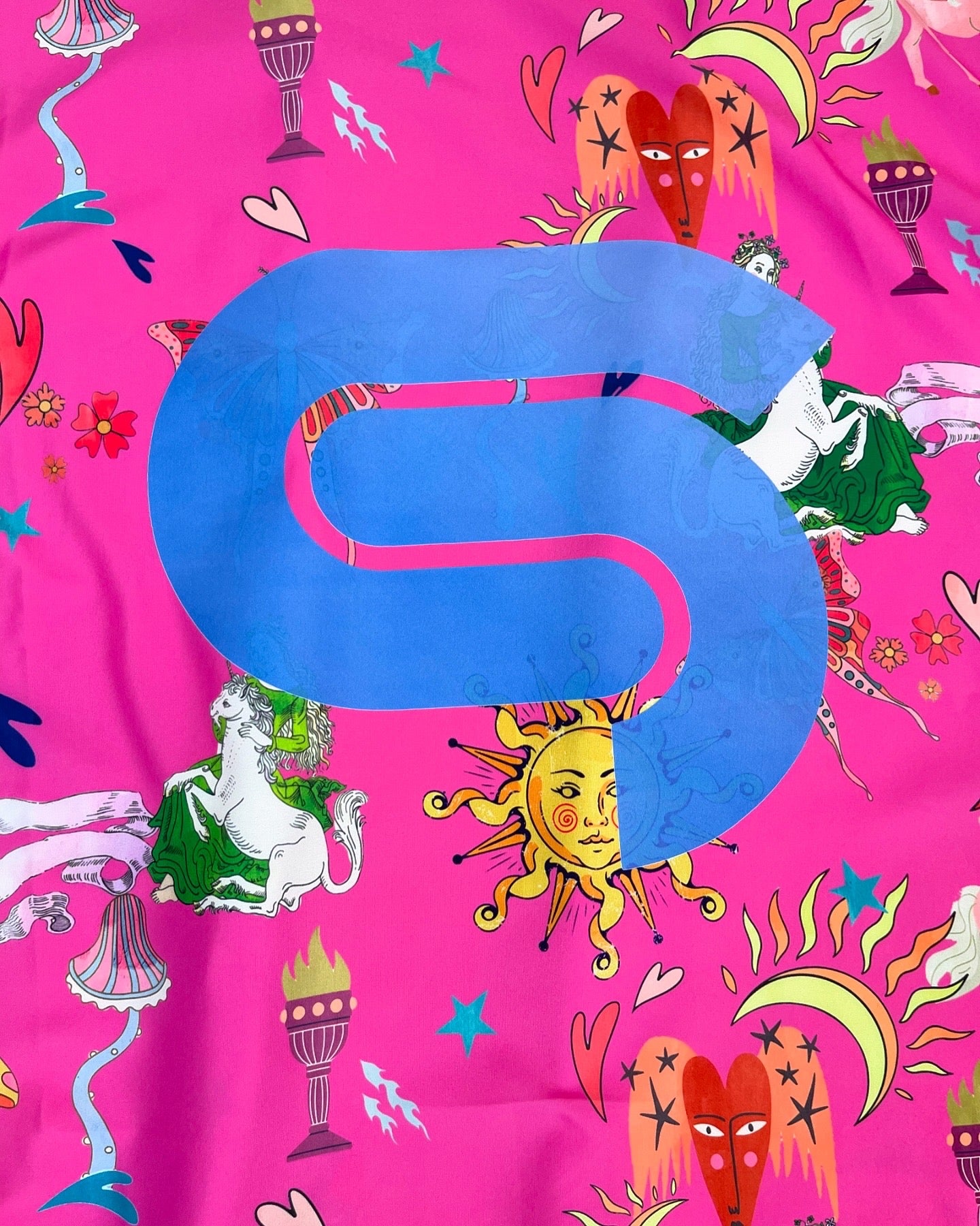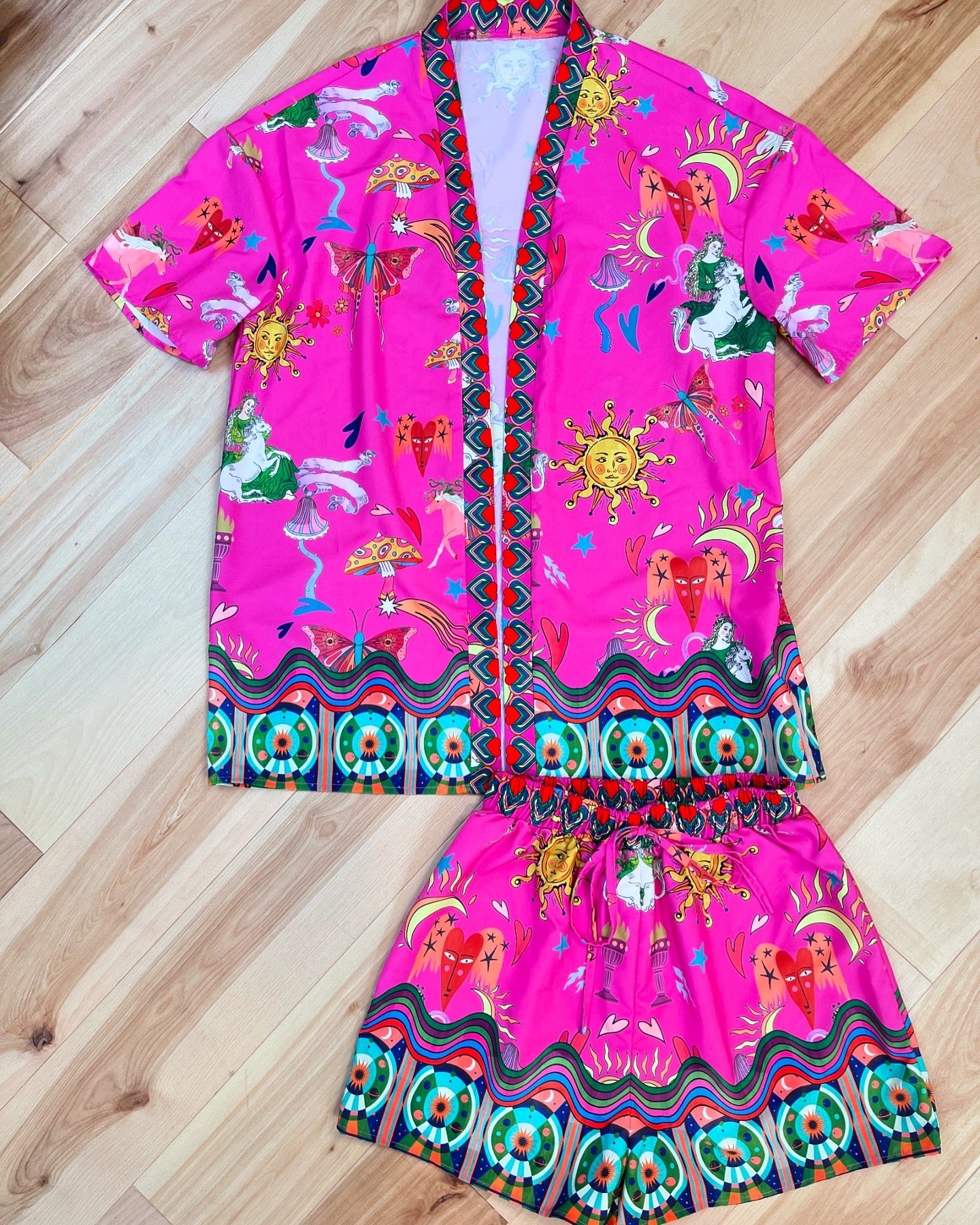 Super comfy, rayon blend, light weight and airy for summer. psychedelic drawing colorful print. Large blueish lavender tint “9” heat pressed with industrial heat press to back of kimono.