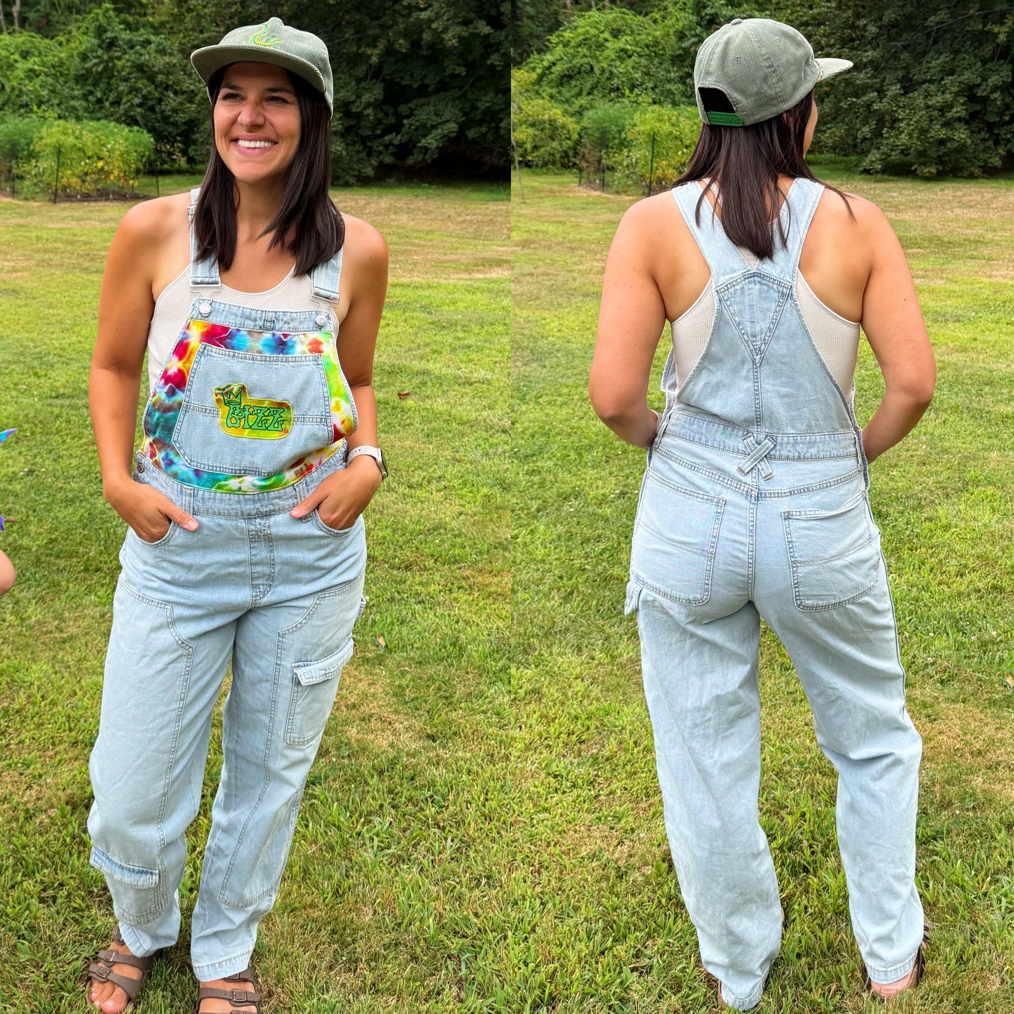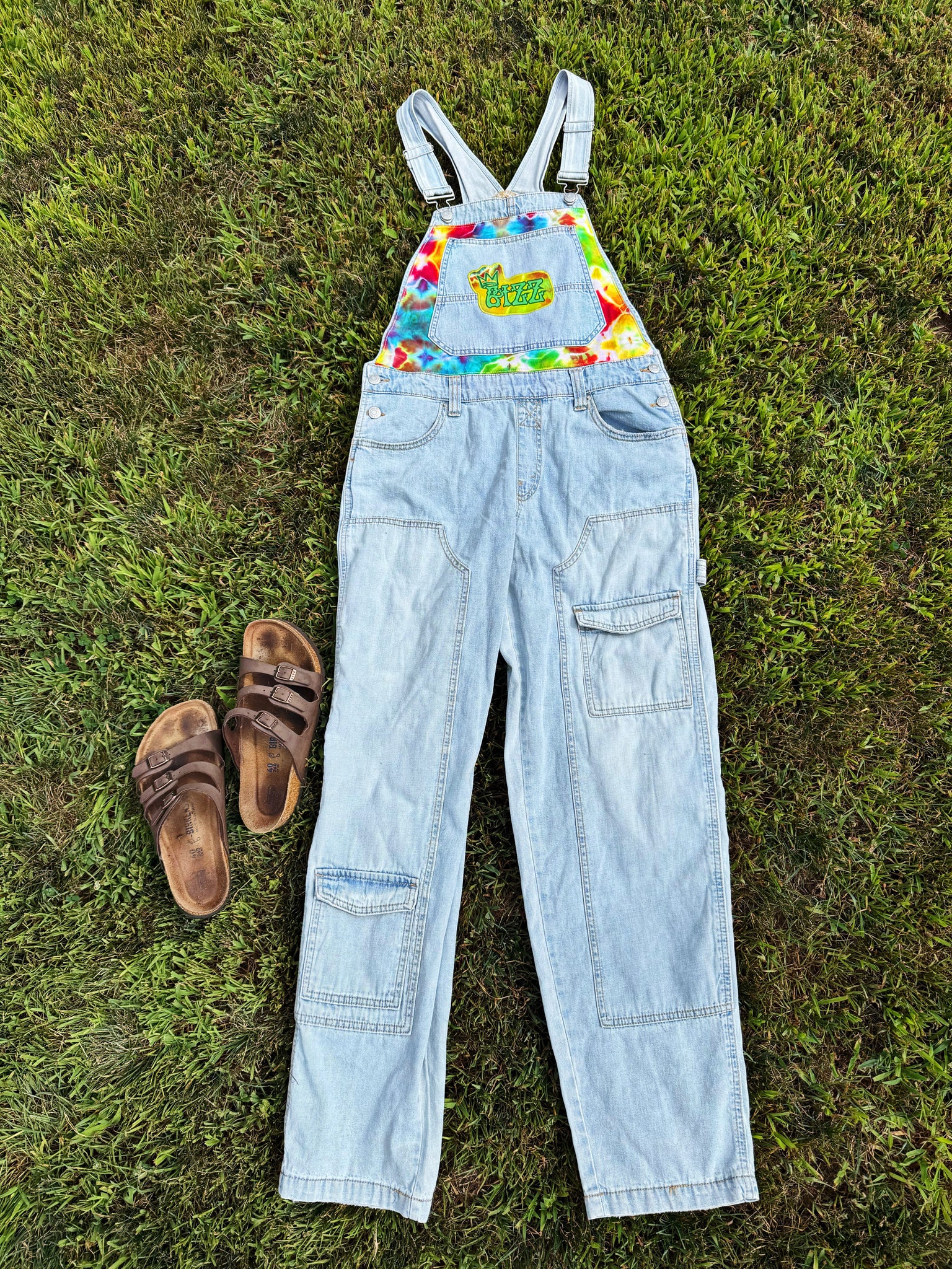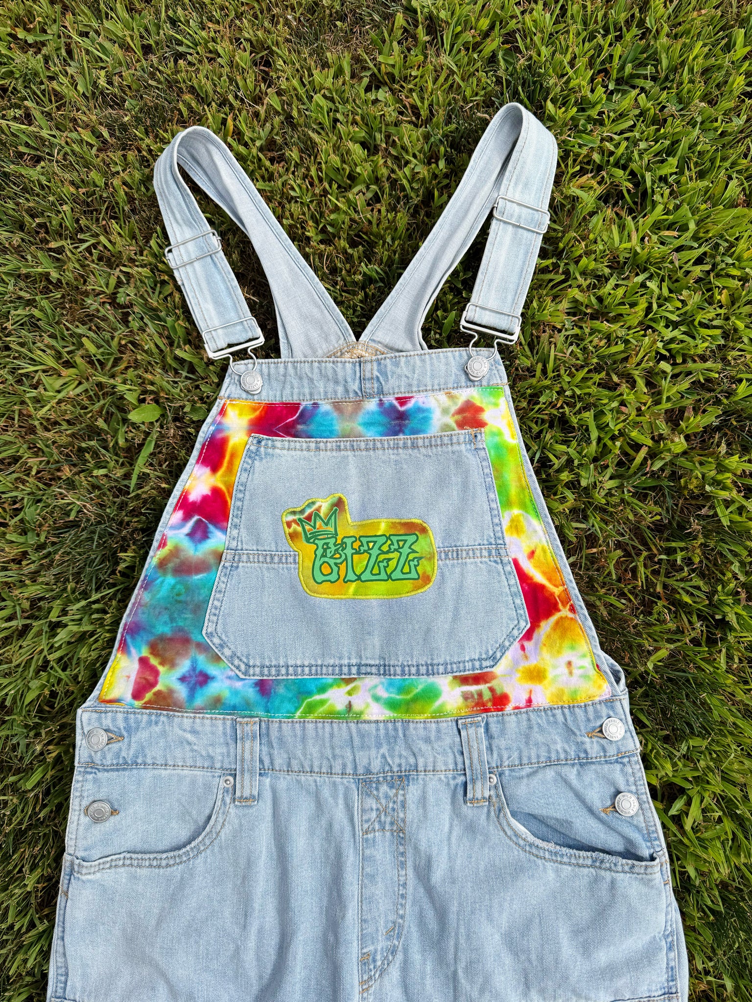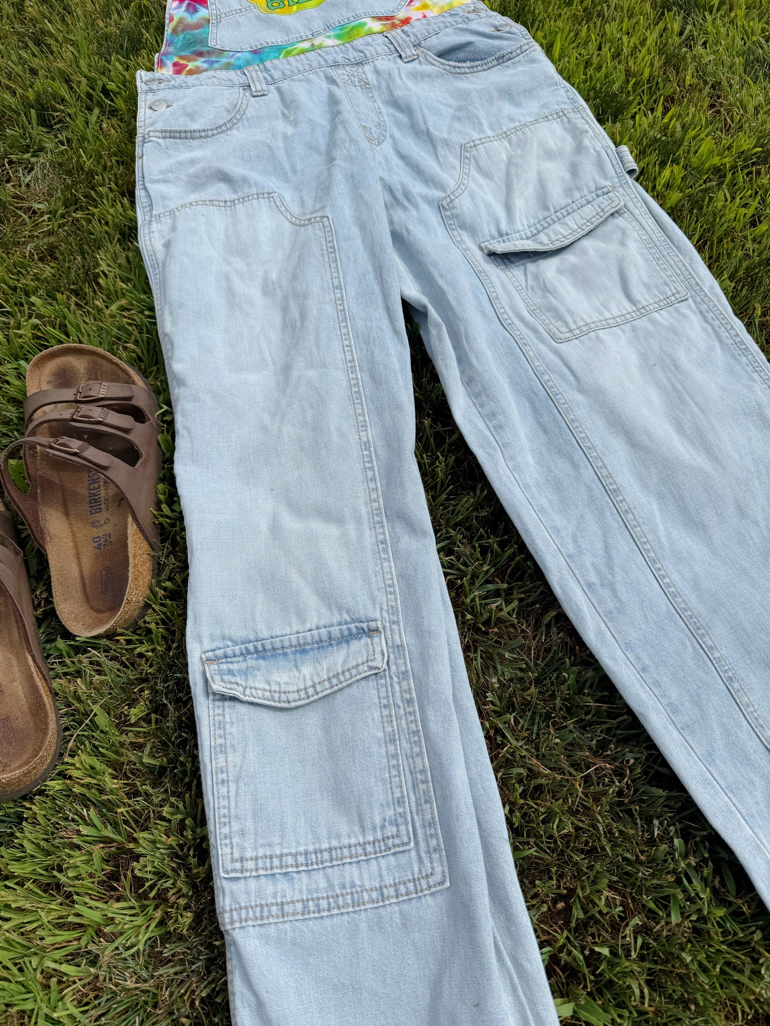 A bit of an oversized fit, baggy cargo overalls cut in a relaxed fit for comfortable all day wear. Button closures on sides. Pockets in front and back. Cargo pockets on both sides. Front chest pocket has King Gizz graffiti design with hand dyed tie dye fabric background. Tie Dye fabric sewn behind front pocket as well.