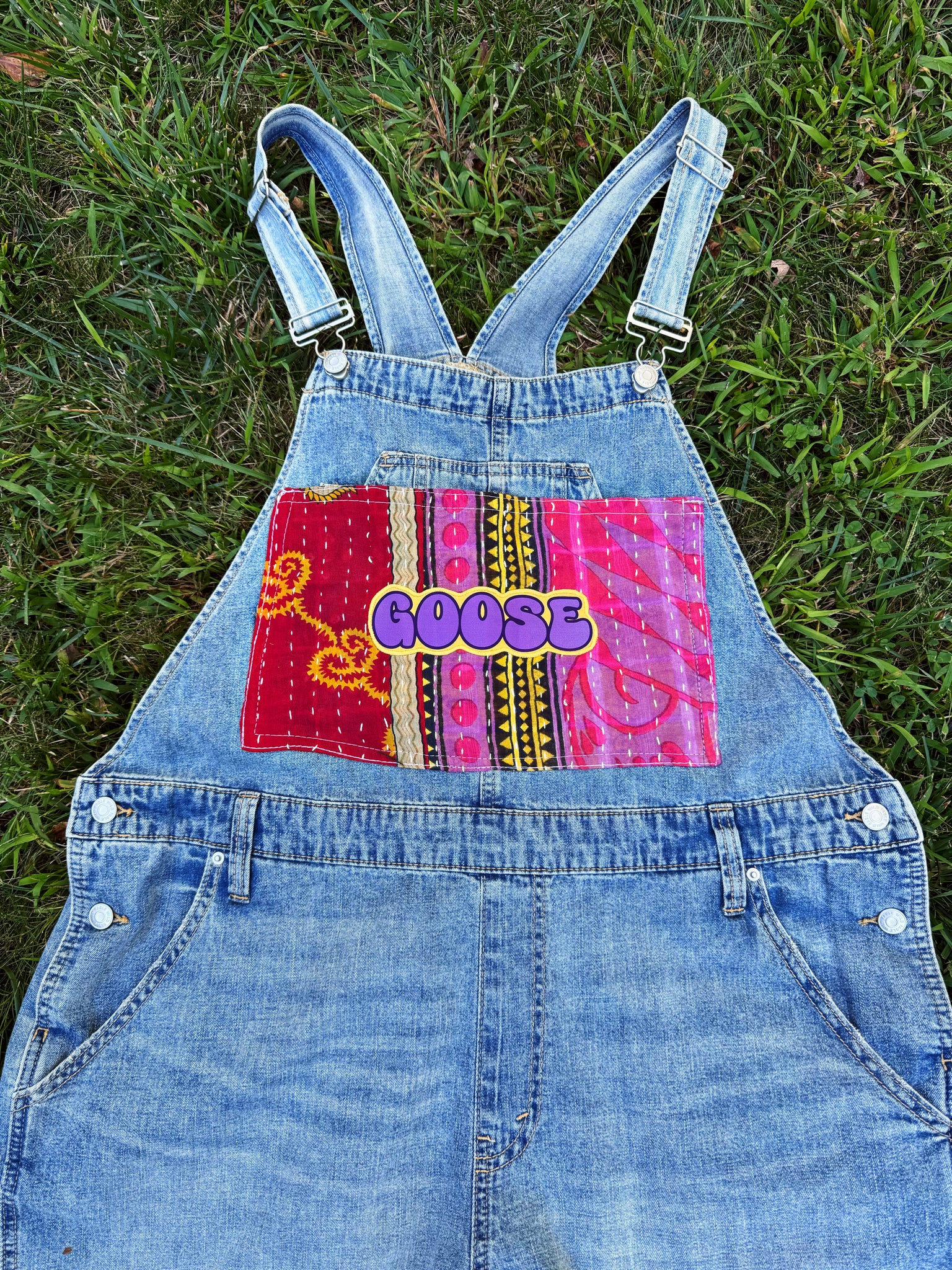 Slightly oversized fit. Classic construction cutoff denim overalls cut in a relaxed fit for comfortable all day wear. Button closures on sides. Pockets in front and back. 3 pockets on front of bibs. One small pocket, one large, and one Upcycled Kantha quilt pocket on top with screen print transfer Goose apolicies sewn on top.