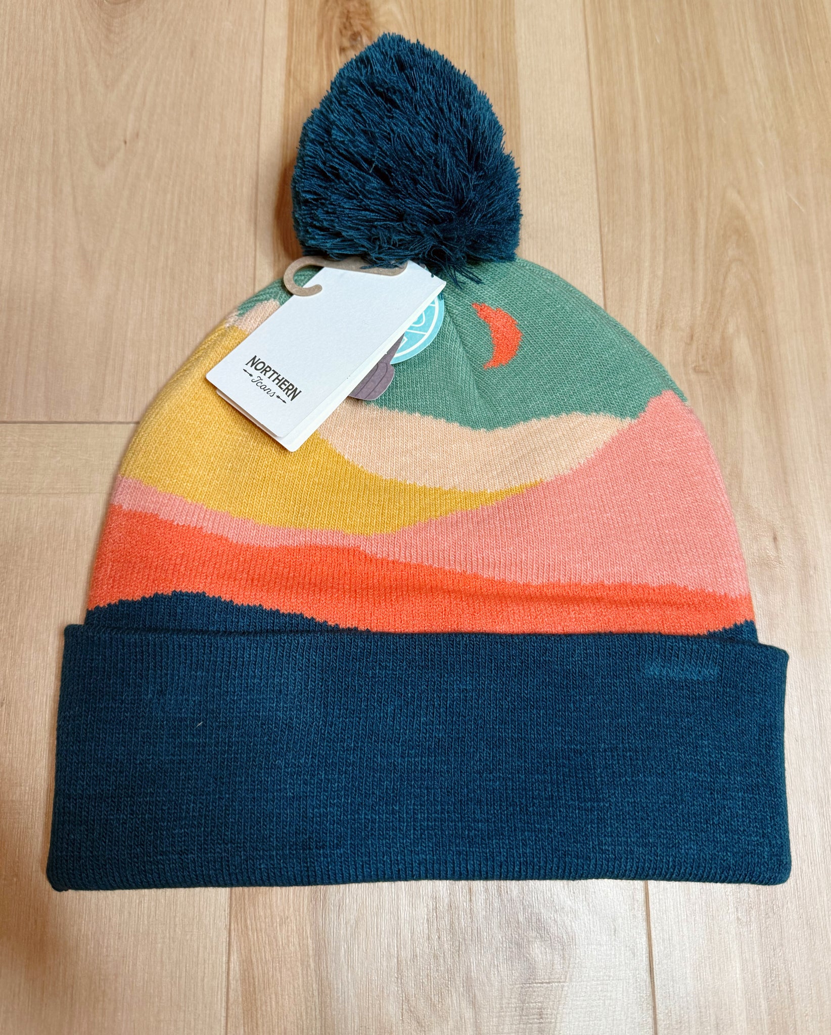 Crescent moon landscape, fold over thick and warm beanie with removable Pom. Goose design sewn to front of beanie.