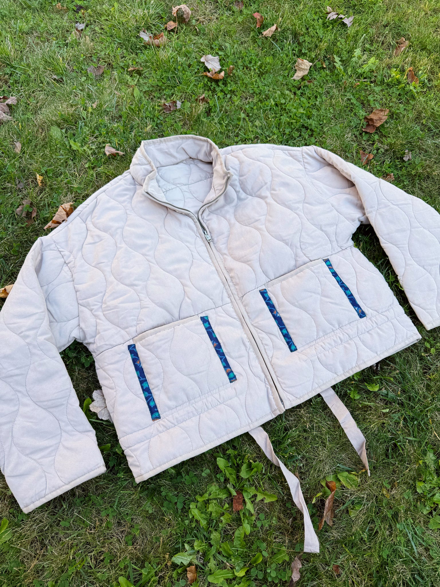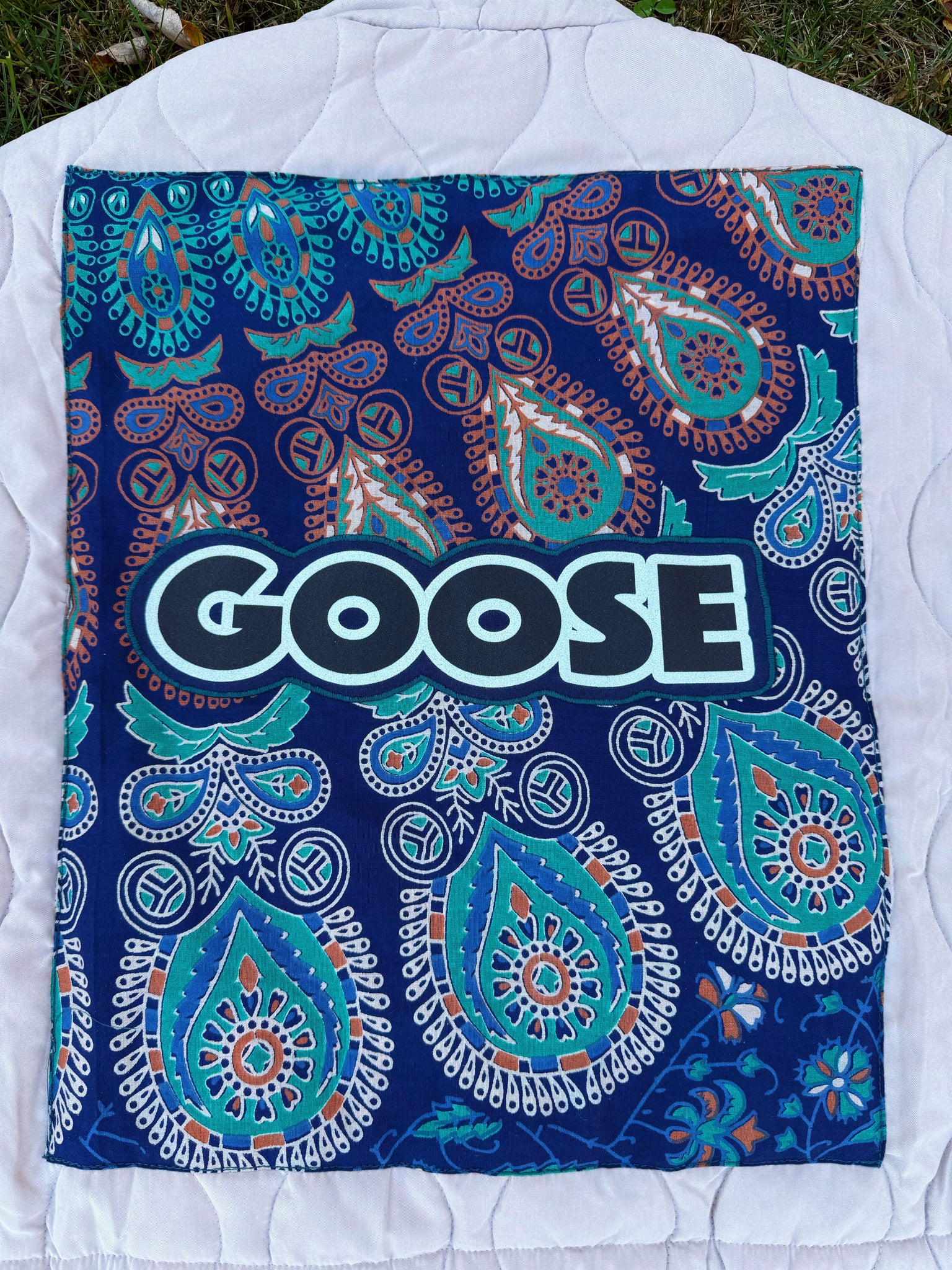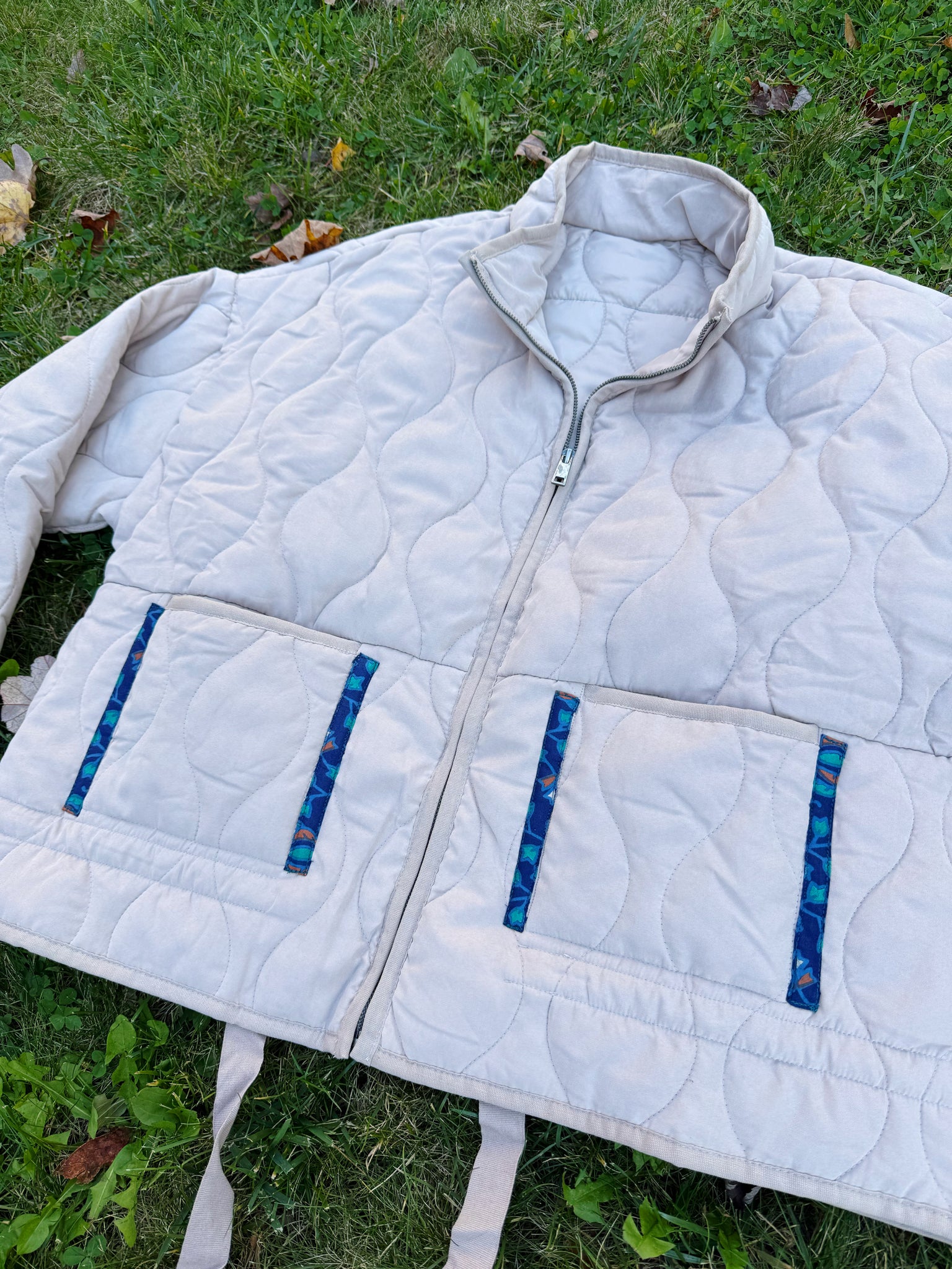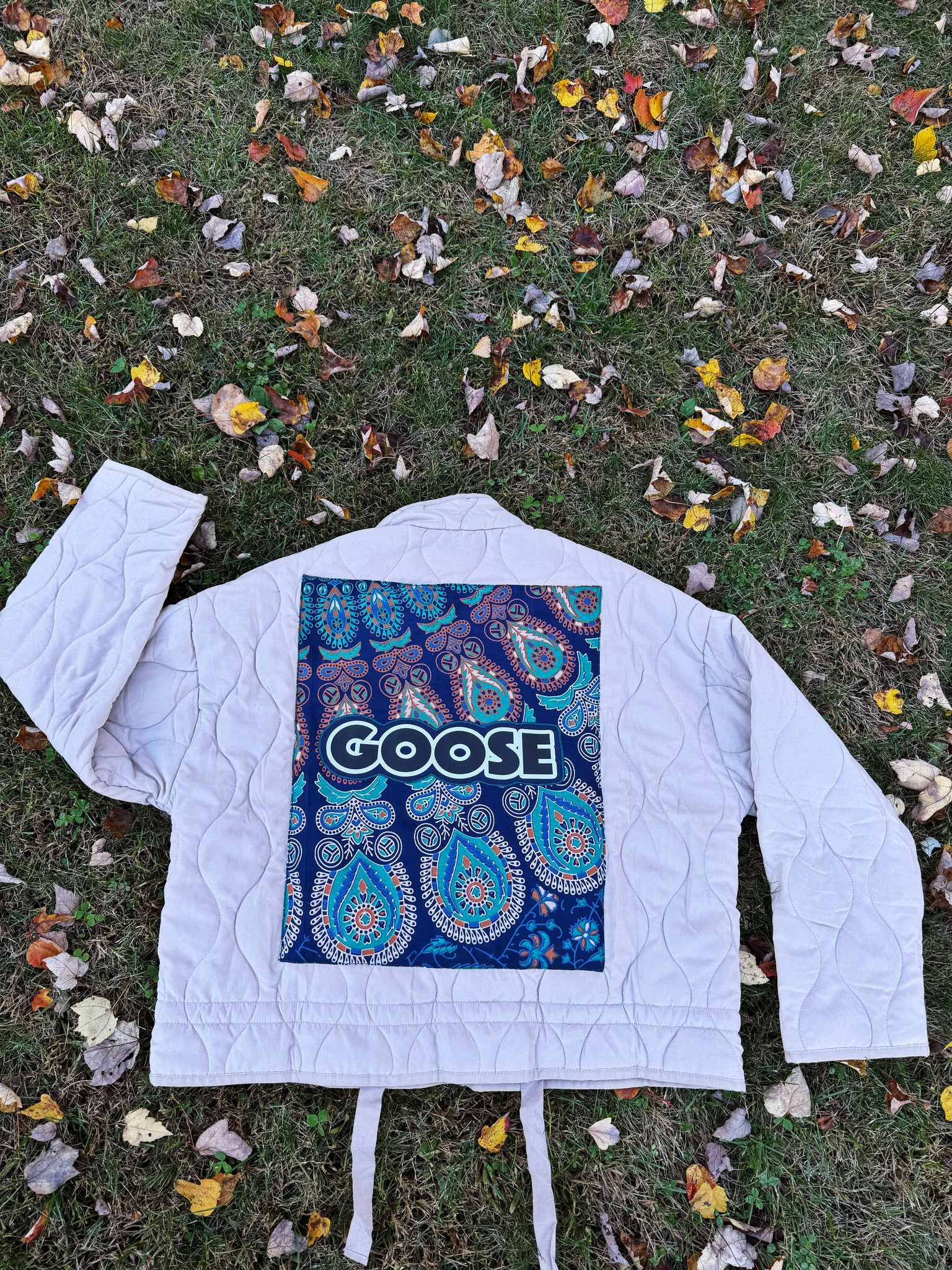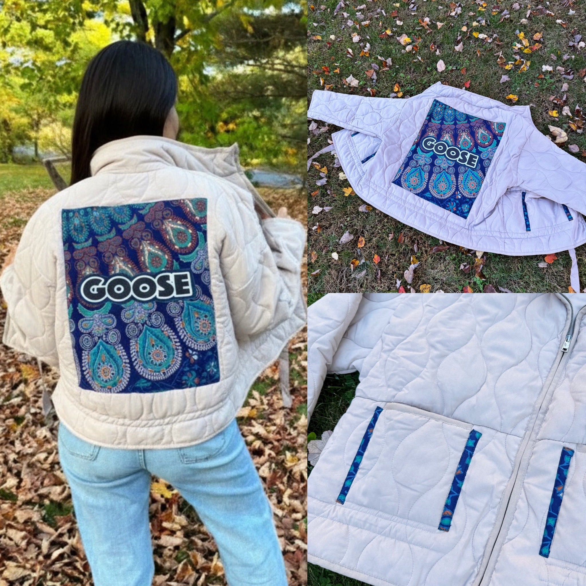 Oatmeal colored, Relaxed Silhouette With Structured Quilting And An Adjustable Drawstring Hem. The Versatile Design Is Perfect For Colder Months, And Can Be Layered Over A Turtleneck Or Casual T-Shirt For A Versatile Look. Repurposed blue and orange tapestry fabric sewn to sides of front pockets and on back with a large Goose appliqué sewn to back.