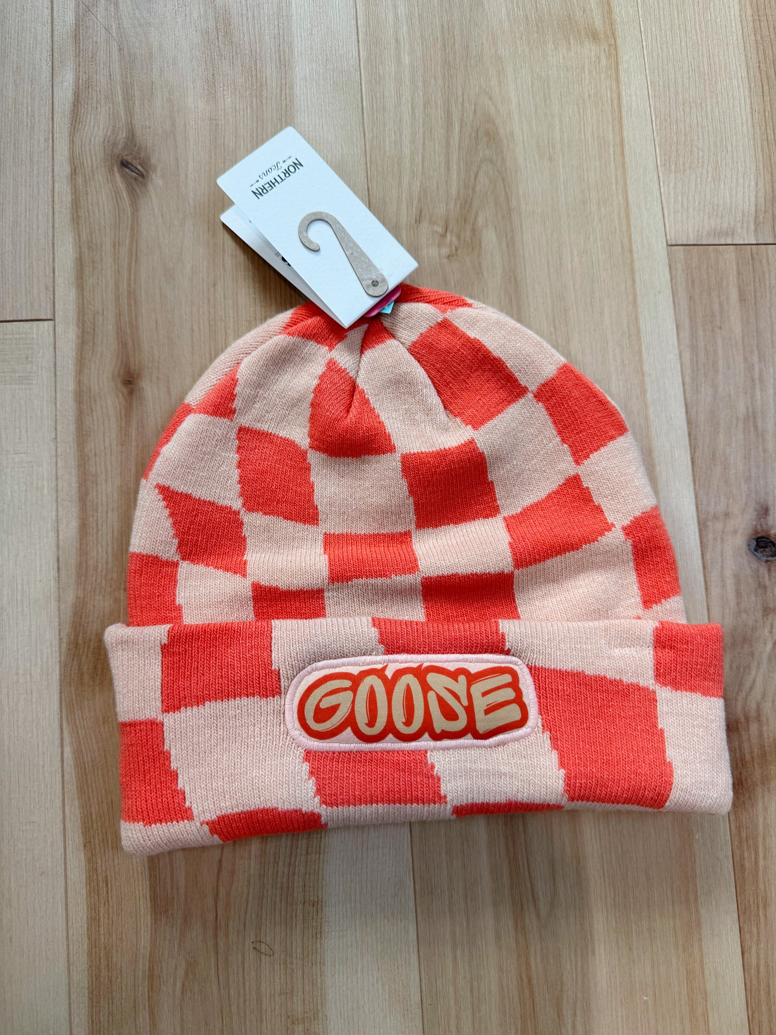 Deep orange skater checks, fold over thick and warm beanie. “GOOSE” in graffiti font sewn to front of beanie.