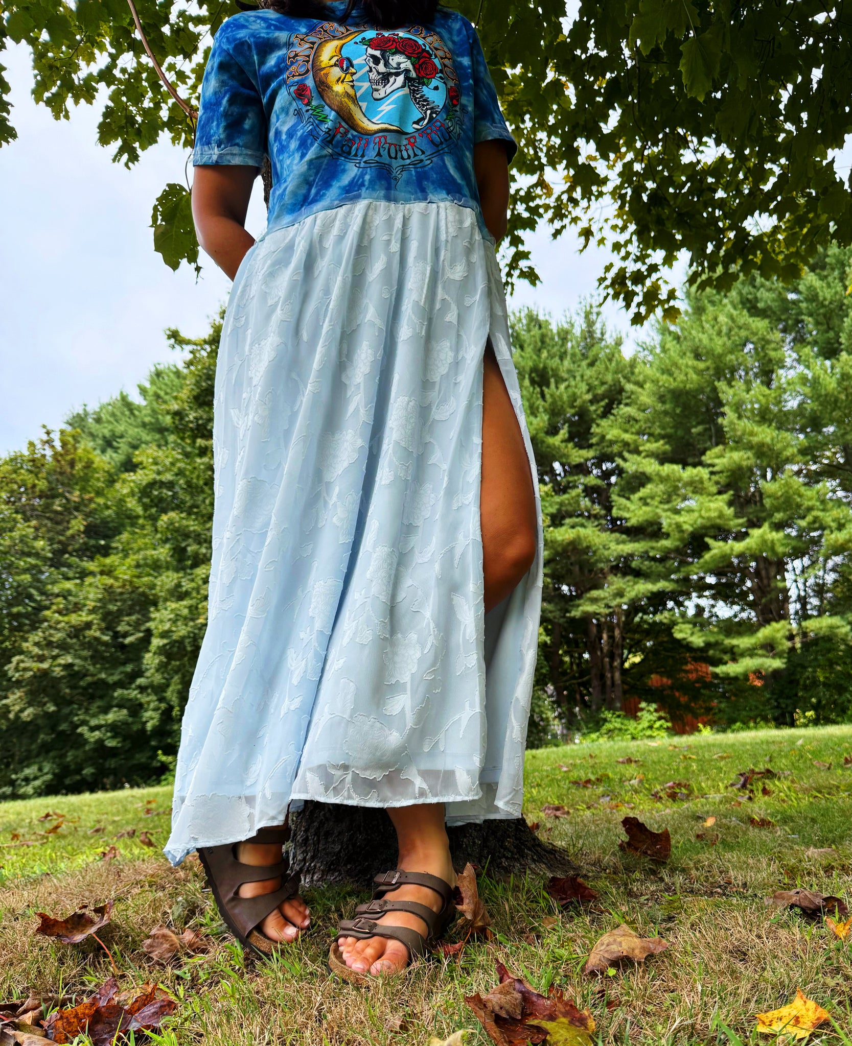 Repurposed official Grateful Dead Fall Tour ‘89 tie dye tee sewn to a jacquard baby blue lace gown. Slit in front. Cute blue tulle sewn to front of waist, and around sleeves.