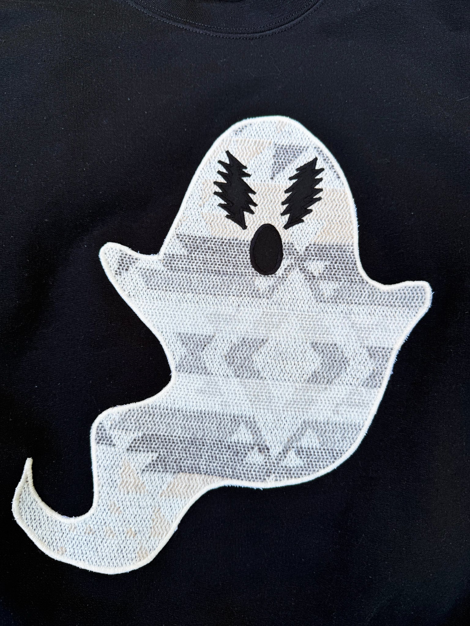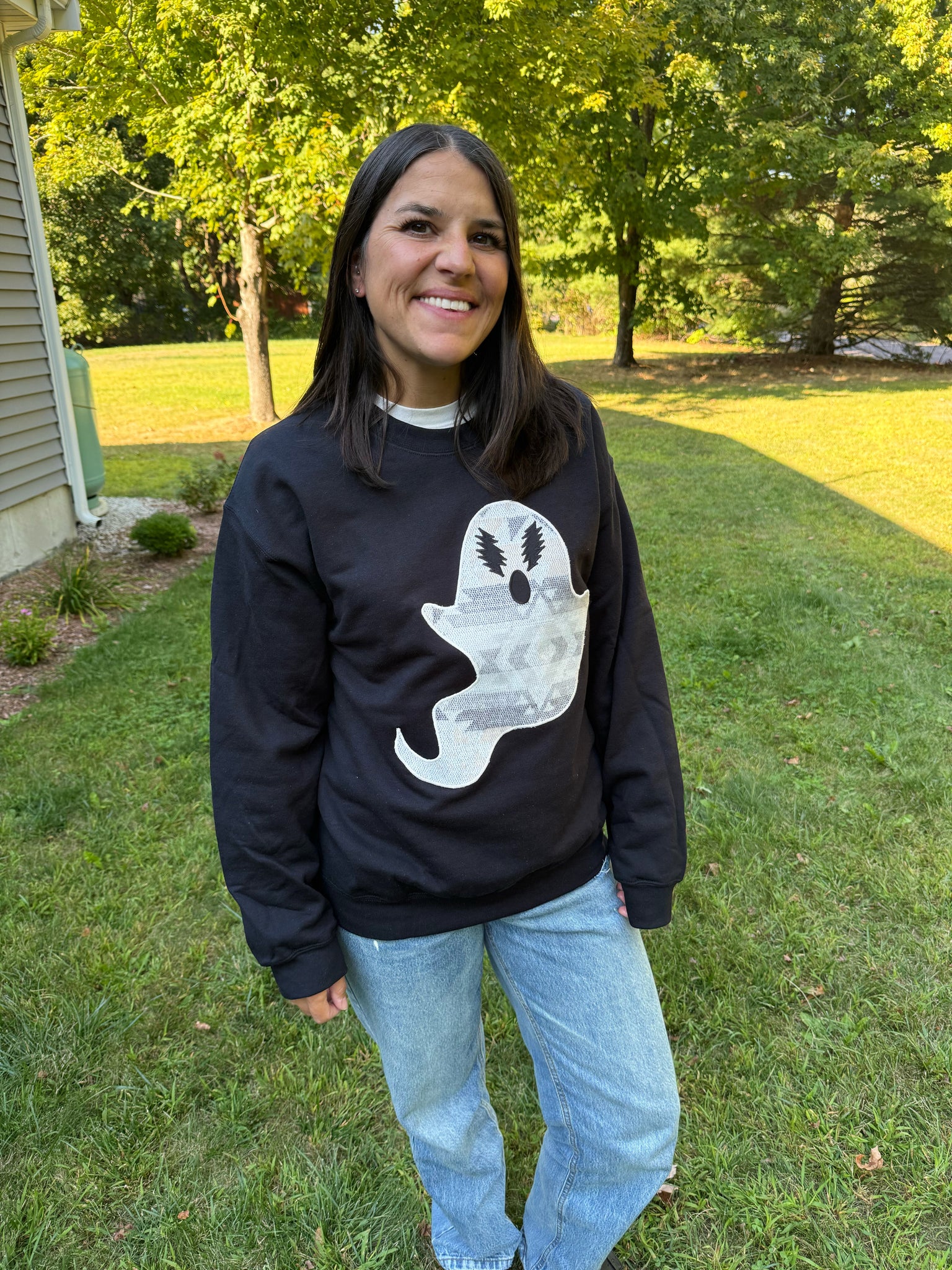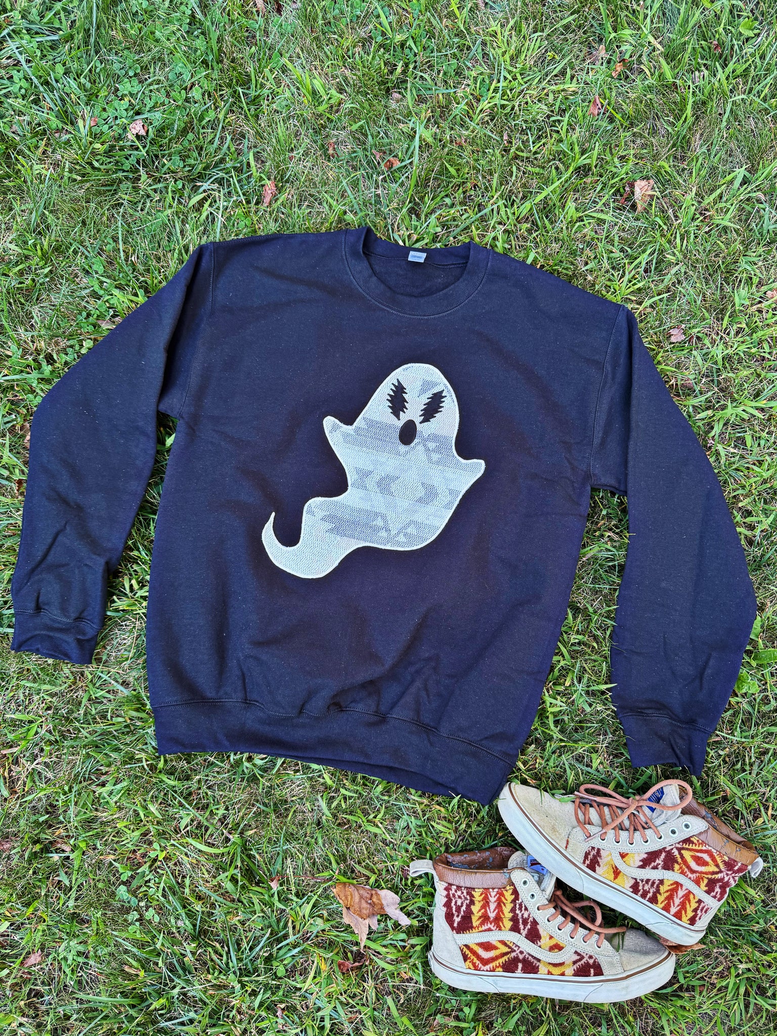 Suuuper soft and comfy fleece and cotton blend pullover crewneck sweatshirt. Gildan Heavy Blend brand. Grey and Offwhite pendelton inspired Ghost appliqué with 13 point bolt eyes, sewn to front of crewneck!