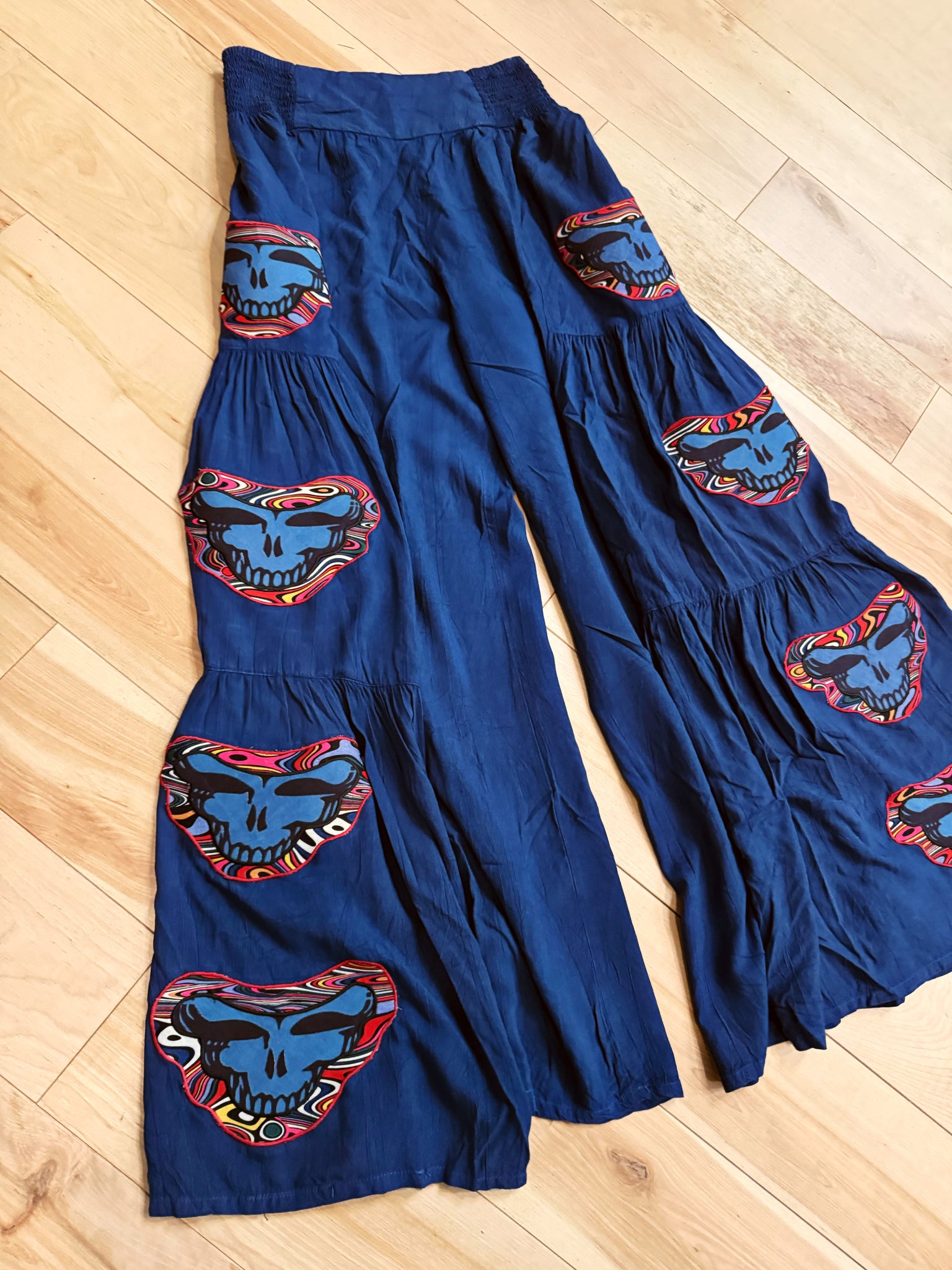 Super soft, comfy and flowy. Wide leg, elastic waist navy blue pants. Psychedelic swirl fabric with stealie faces sewn on top. 4 sewn down each pant leg. So fun for dancing.