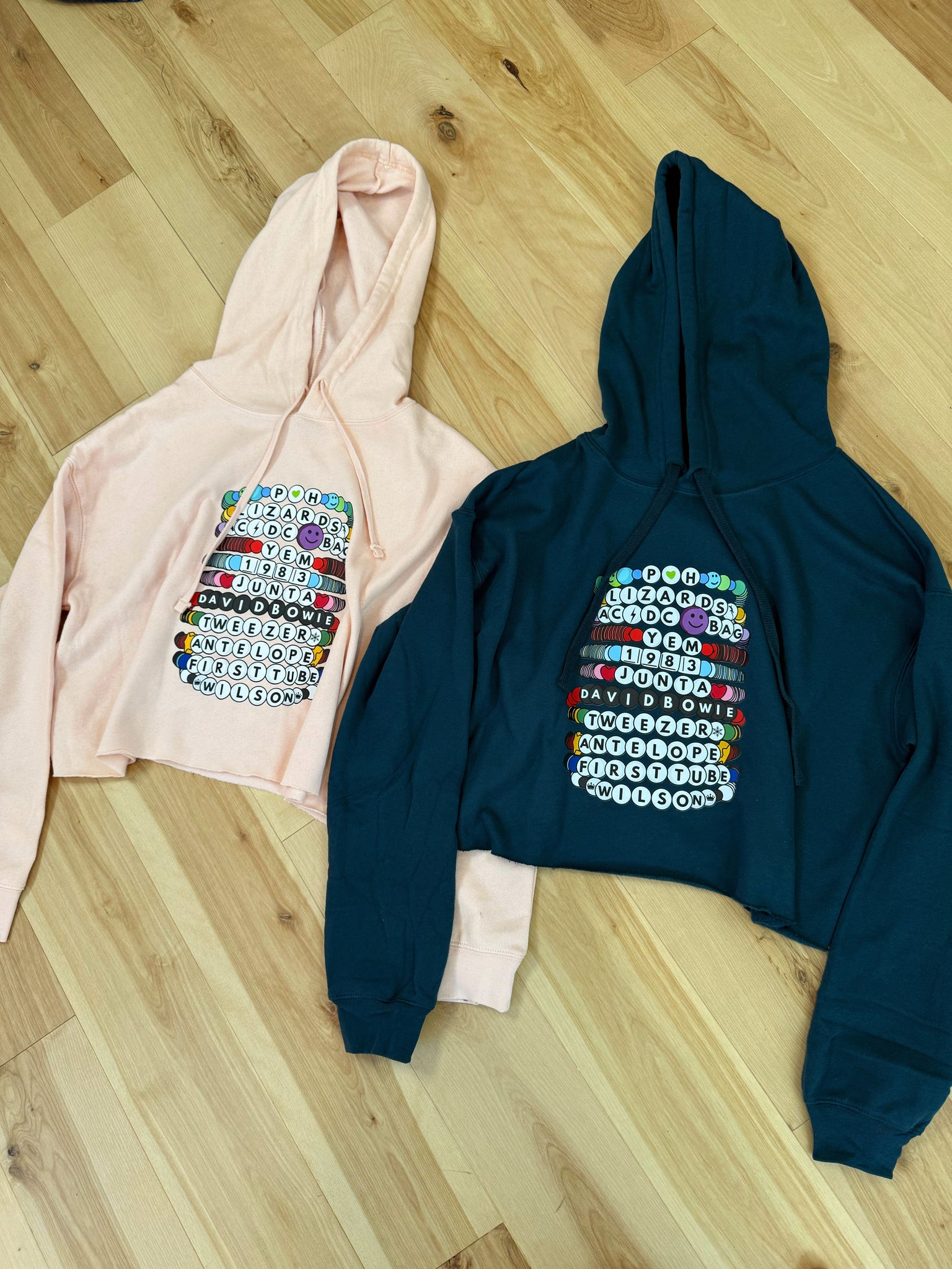 Cute and comfy, pullover hooded cropped sweatshirt. Drawstring hood. Choice of Blush or Atlantic with Phish Kandi bracelet design, industrially heat pressed to center.