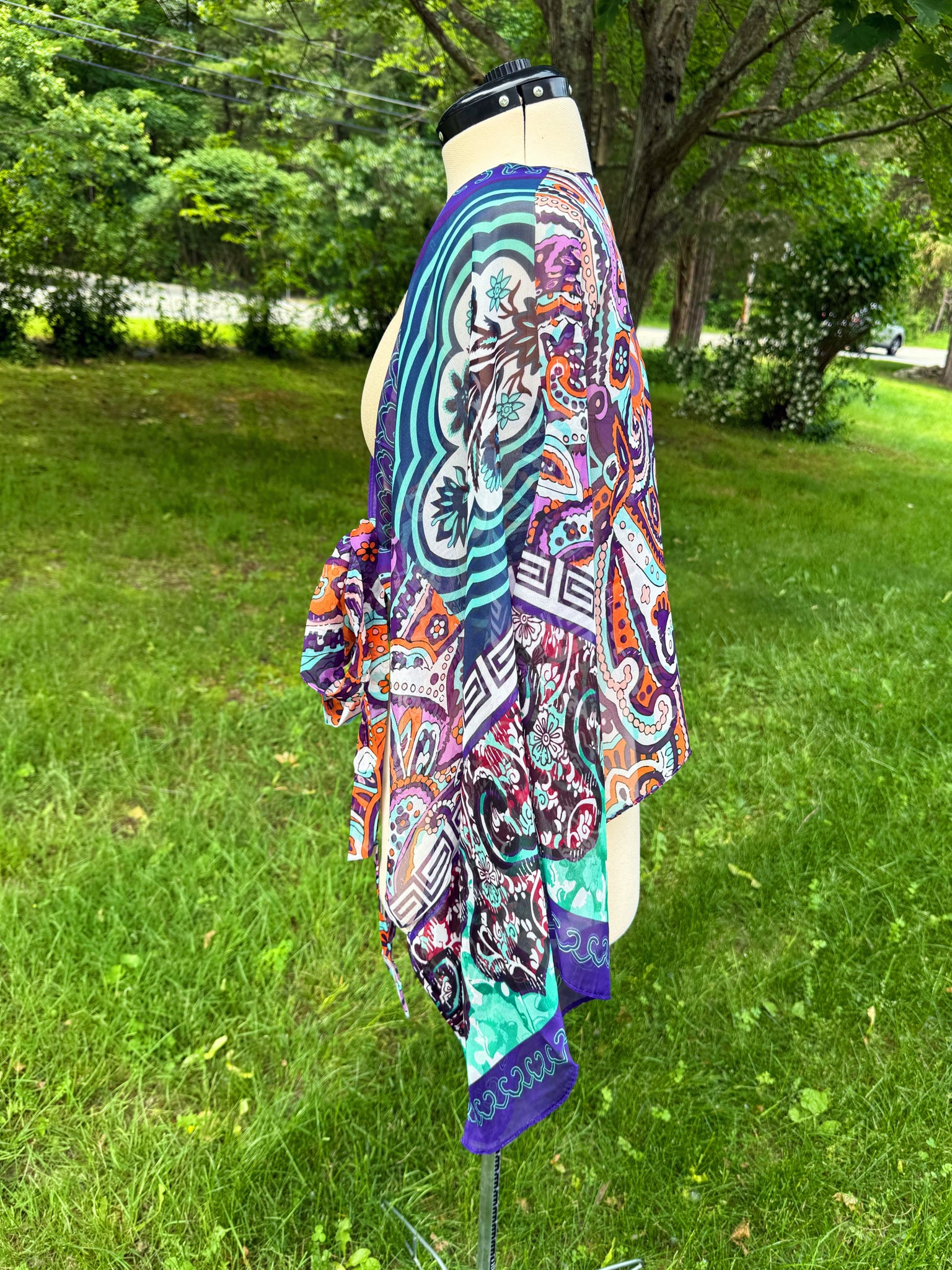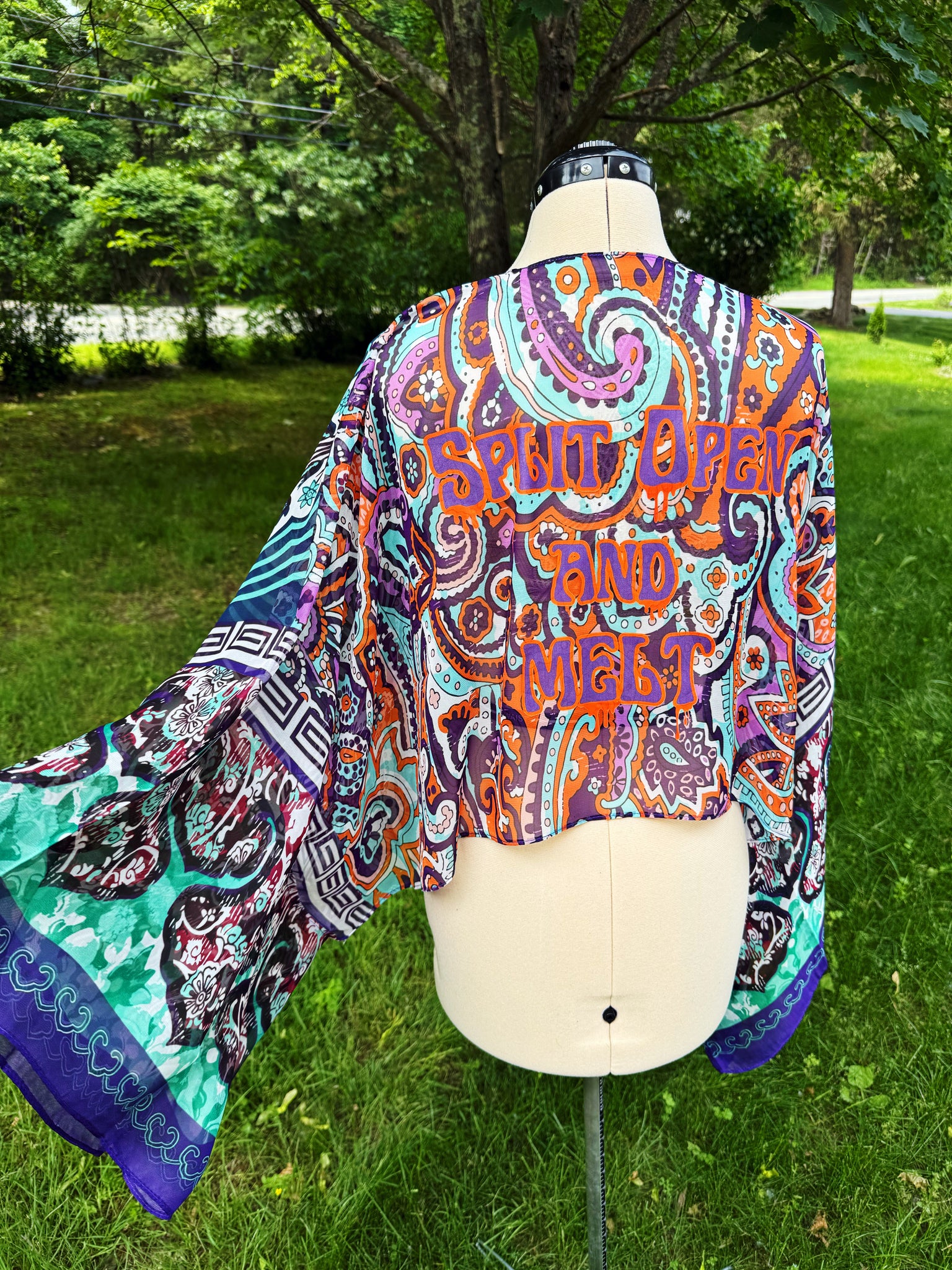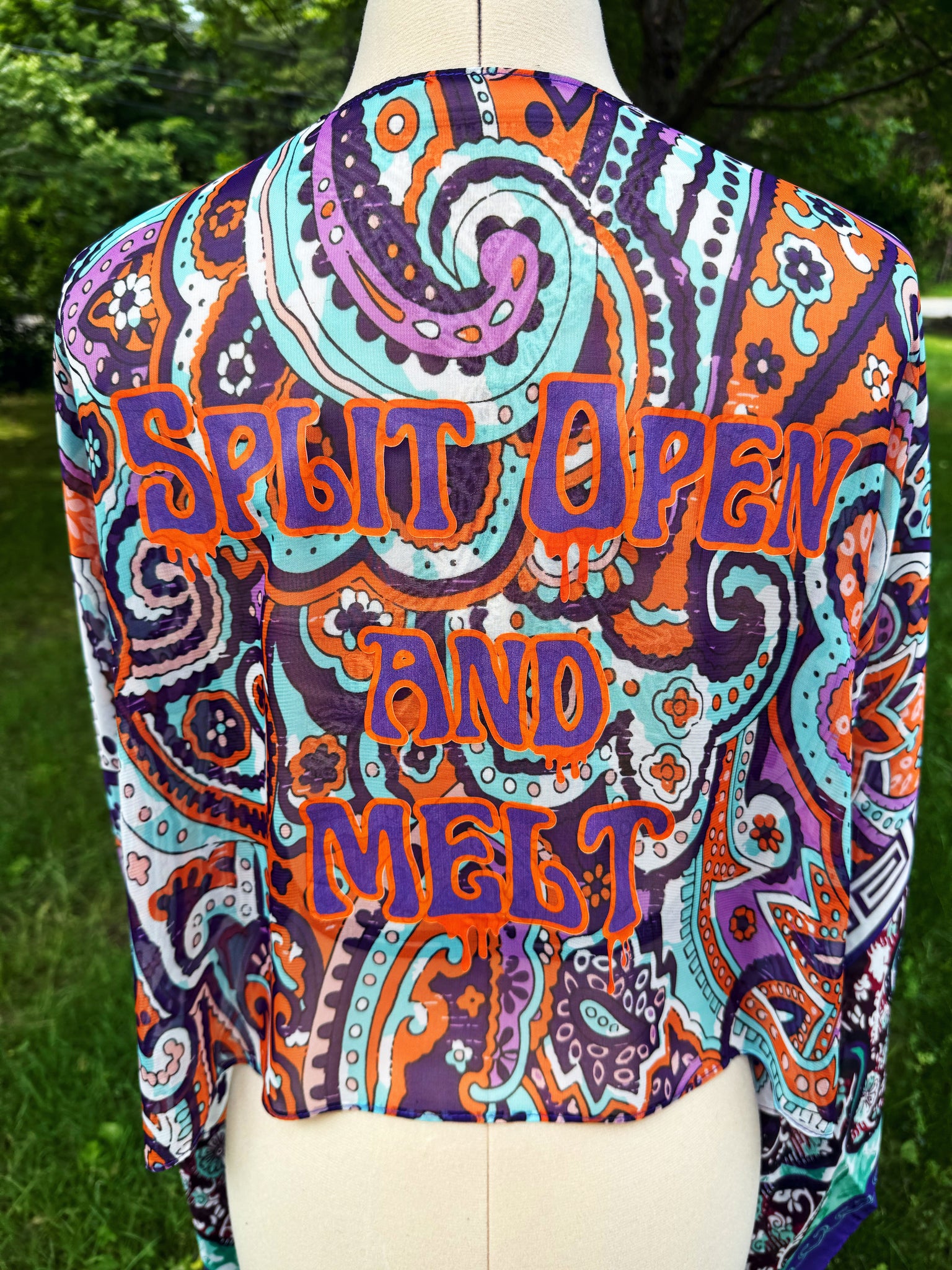 Bold, funky, mixed paisley patterns. Large flowy armholes. Tie front detail. Cute to wear over outfit or dress for summer shows. Fun breezy silhouette. "Split Open and Melt”, drippy design lyrics screen print transfer (mixture of powder and ink, not vinyl) design heat pressed to back.