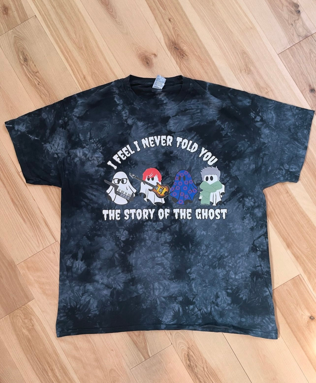 Black on black tie dye tee with Story of the Ghost graphic heat pressed to chest.
