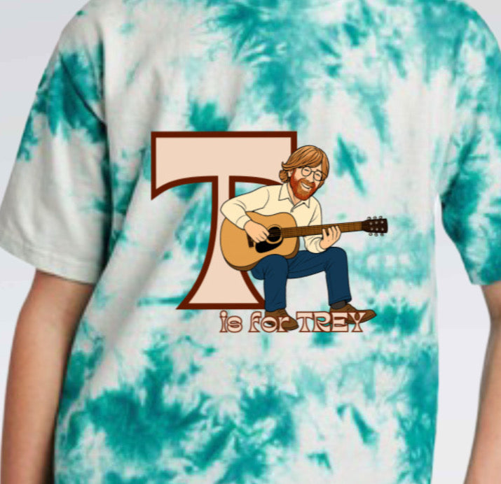 Deep Teal tie dye cotton tee with “T is for Trey” 2.0 graphic designed by me, and heat pressed to front of shirt with Industrial heat press.