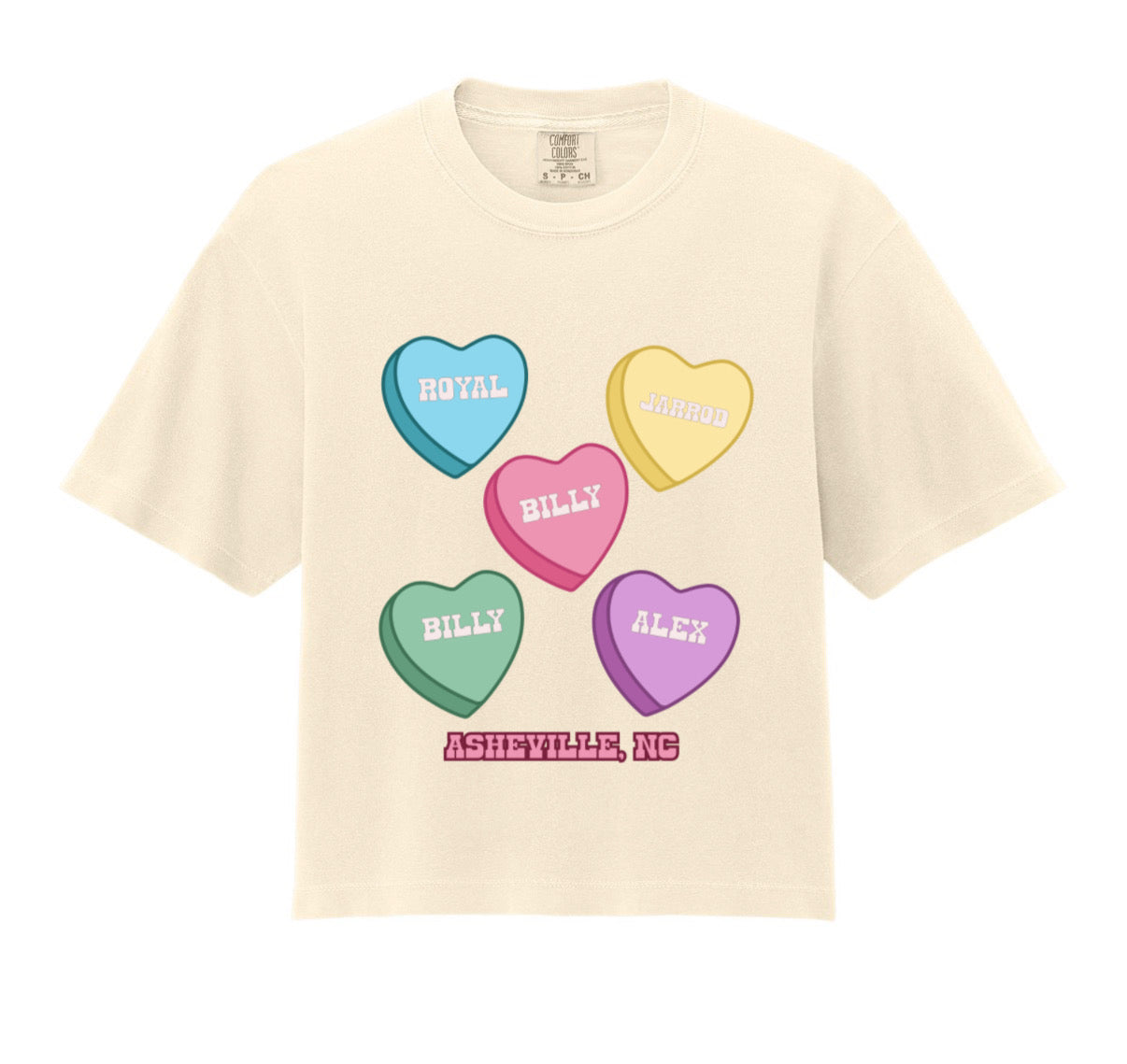 Billy Strings Band member names in Candy Heart design with “Asheville, NC” on bottom. Made to commemorate the Valentines Day run in Asheville!