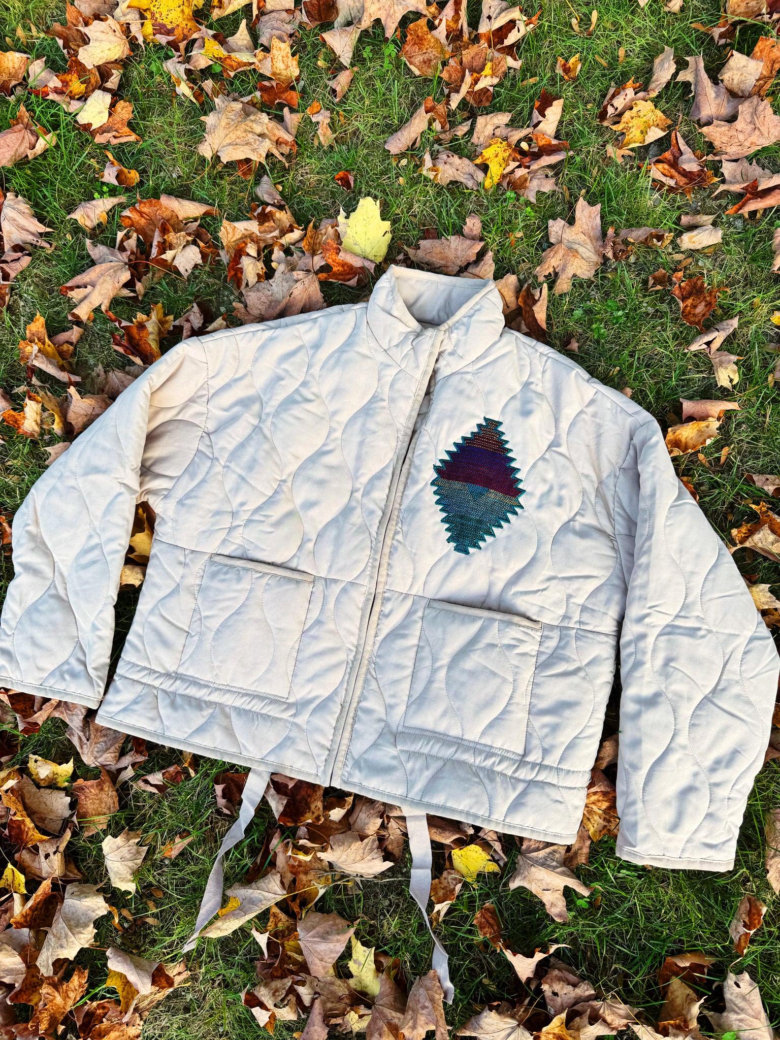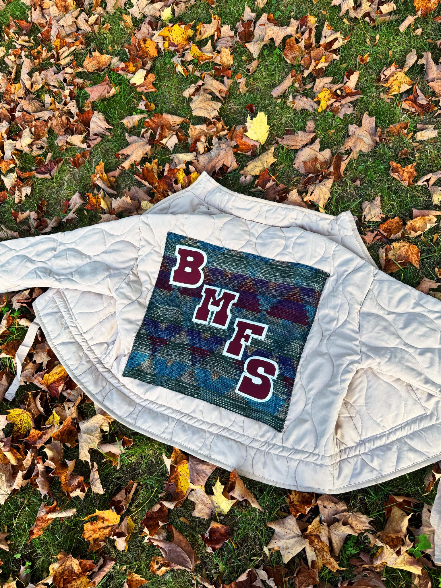Relaxed Silhouette With Structured Quilting And An Adjustable Drawstring Hem. The Versatile Design Is Perfect For Colder Months, And Can Be Layered Over A Turtleneck Or Casual T-Shirt For A Versatile Look. Repurposed pendleton inspired mountain fabric sewn to back with western font “BMFS” appliqués sewn to back. Small mountain fabric appliqué sewn to front.