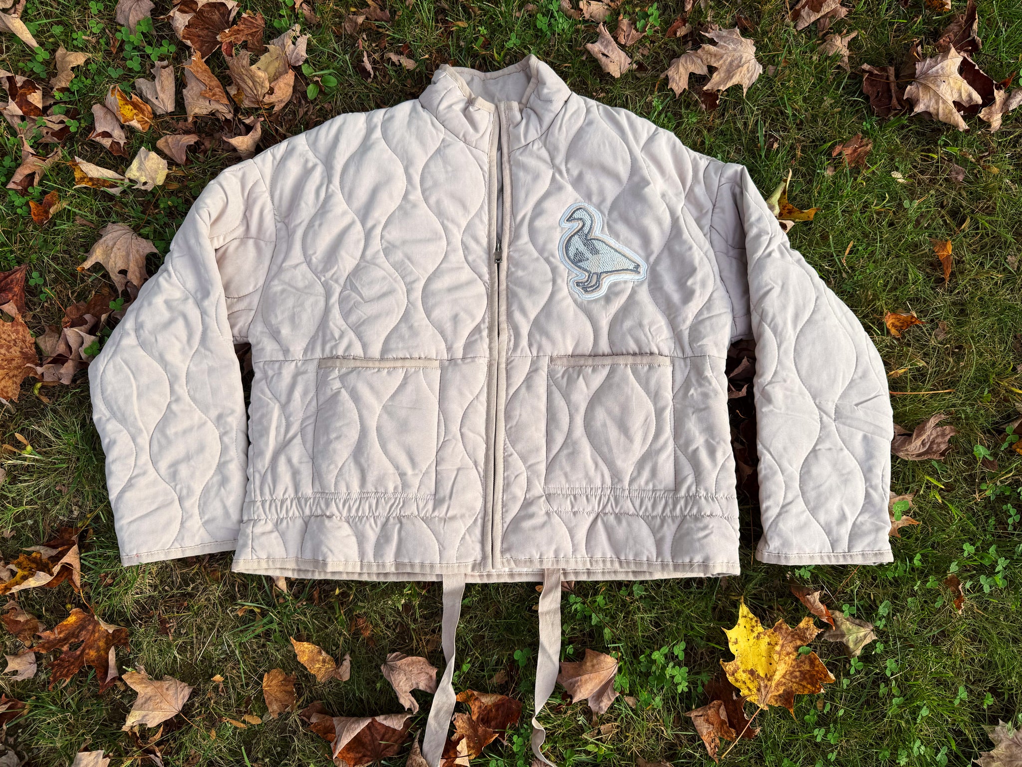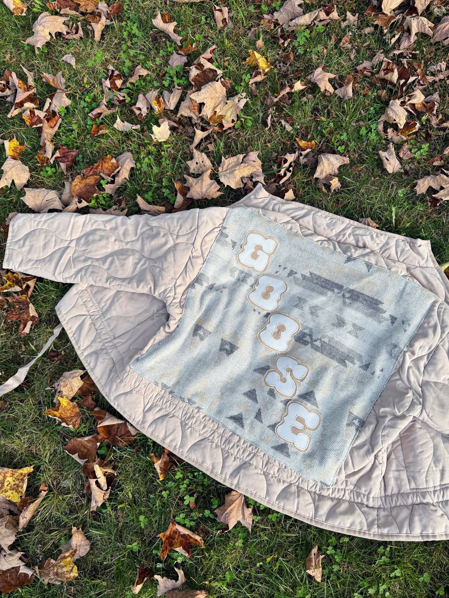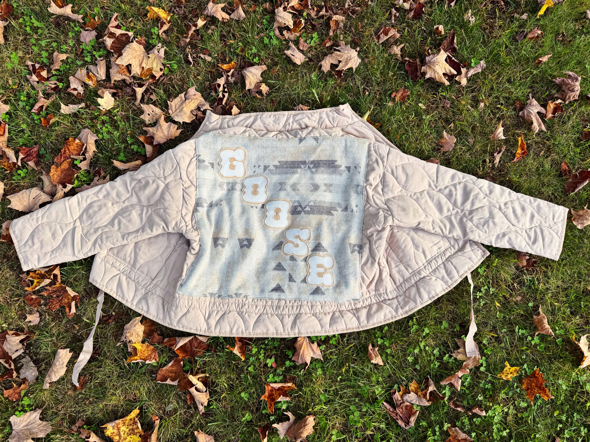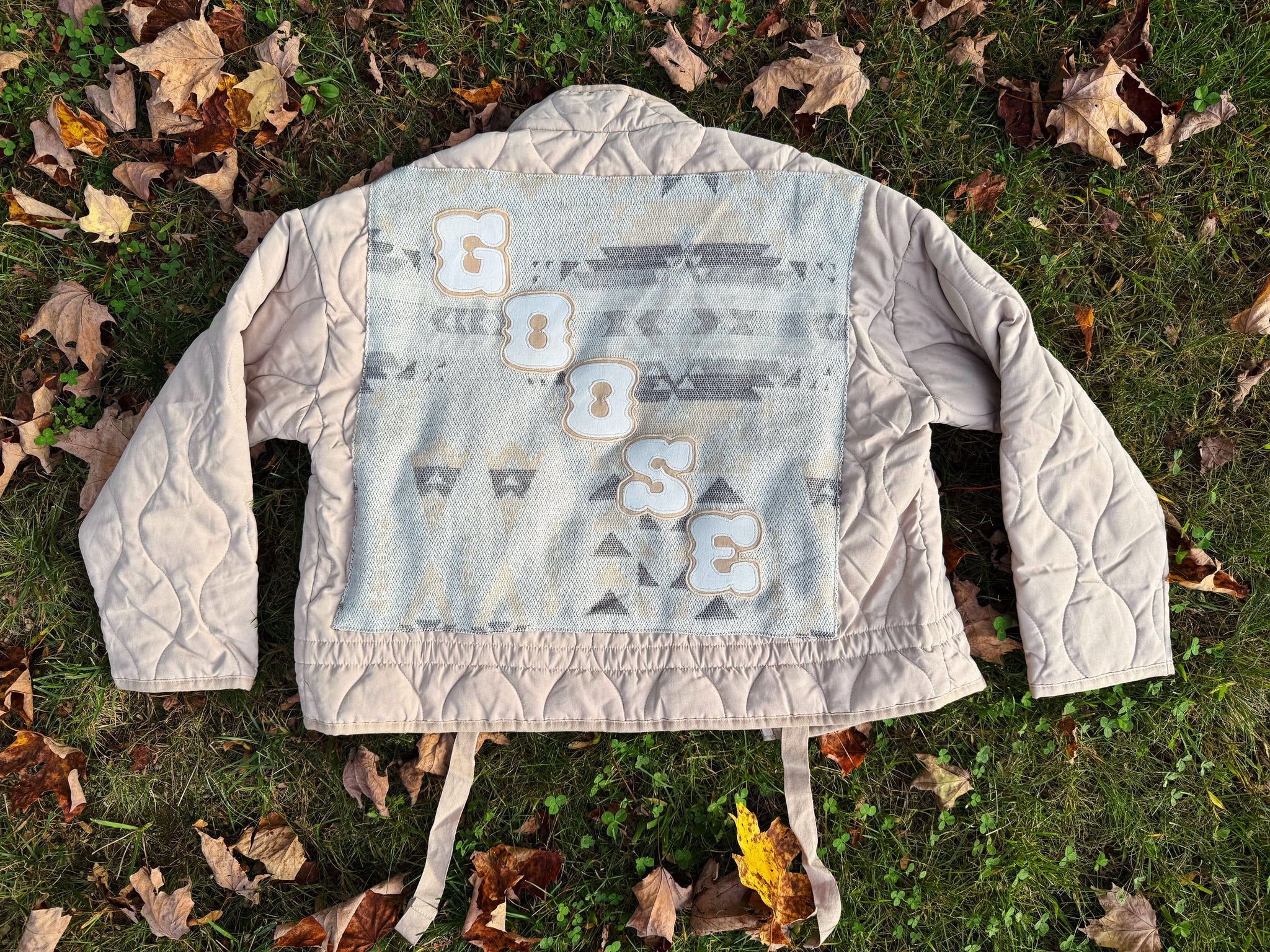 Relaxed Silhouette With Structured Quilting And An Adjustable Drawstring Hem. The Versatile Design Is Perfect For Colder Months, And Can Be Layered Over A Turtleneck Or Casual T-Shirt For A Versatile Look. Repurposed pendleton inspired mountain fabric sewn to back with western font “Goose” appliqués sewn to back. Small mountain fabric goose appliqué sewn to front.