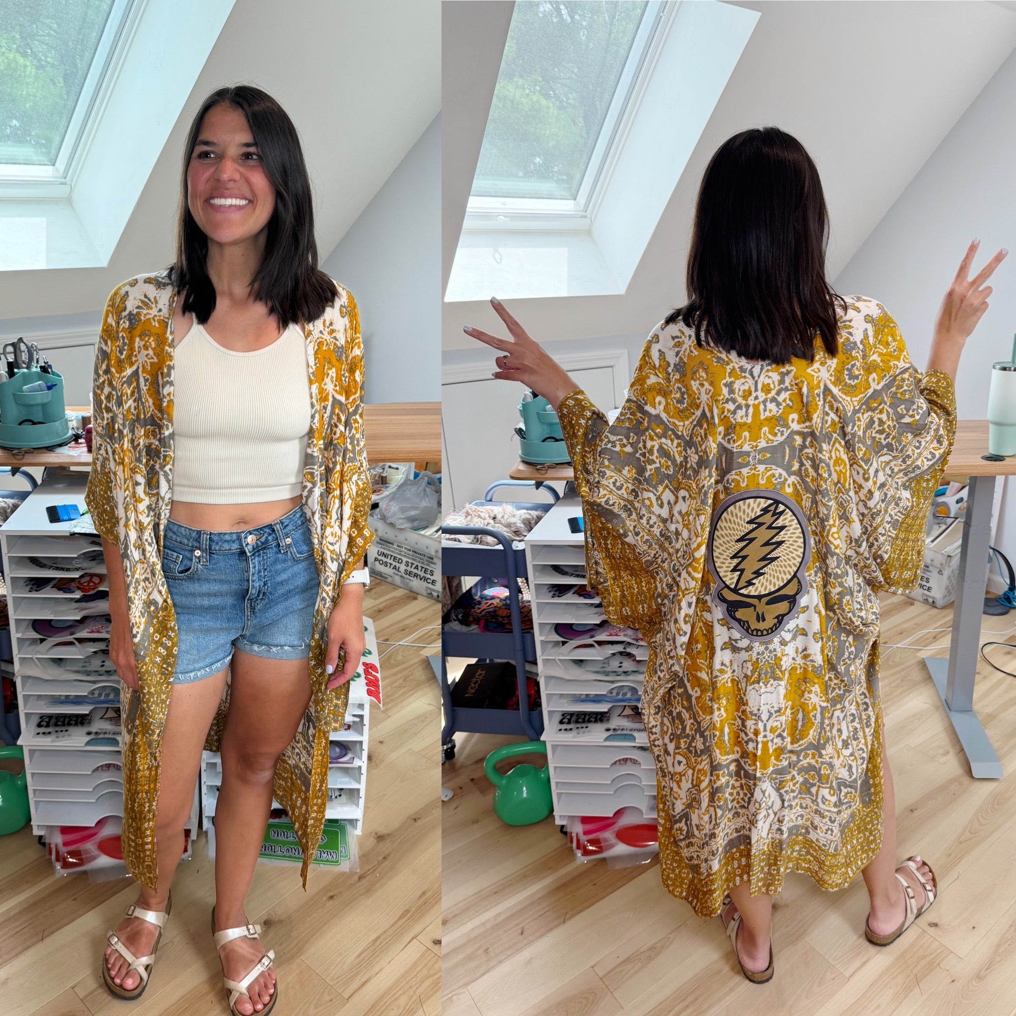 Suuuuper soft and comfy, abstract geometric print in grey and mustard. Short wide sleeves with longer back. Bold, poetic and effortless to wear. Upcycled grey and brown Stealie appliqué sewn to back.