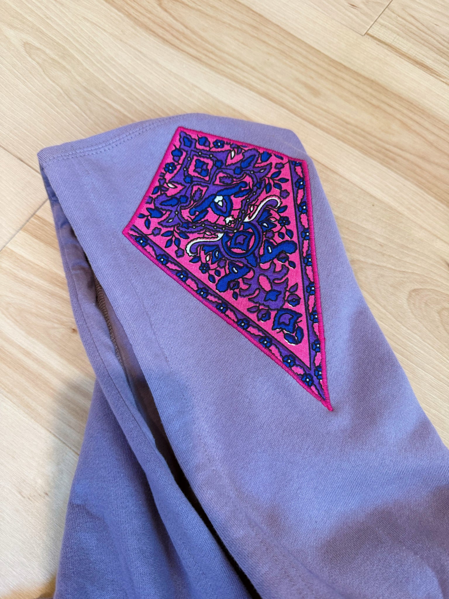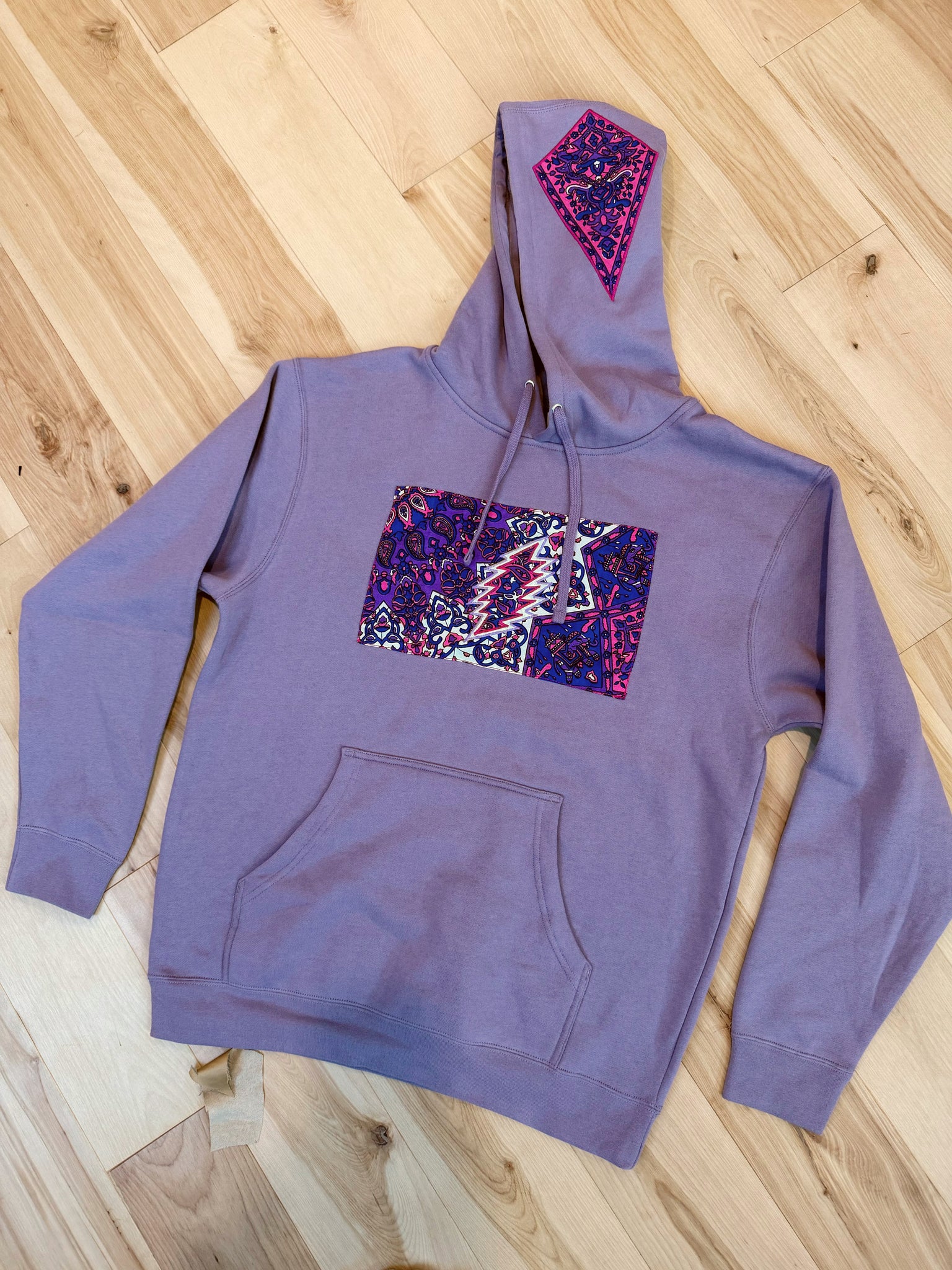 Super soft Midweight purple hooded sweatshirt. Upcycled Purple elephant tapestry with 13 point bolt sewn to front. Tapestry detail sewn to hood. One large front pocket.
