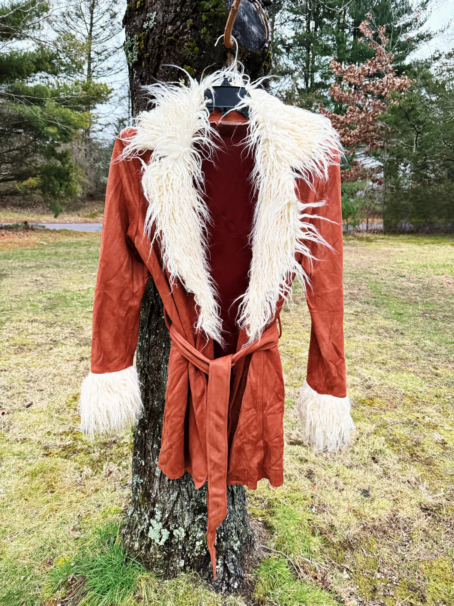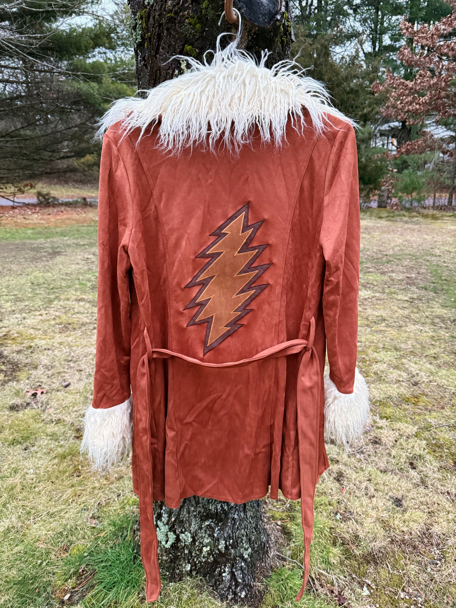 Camel Colored Faux Suede penny lane faux fur trim jacket. Tie front style. Two front pockets! Layered faux suede, 13 point bolt appliqué sewn to back.